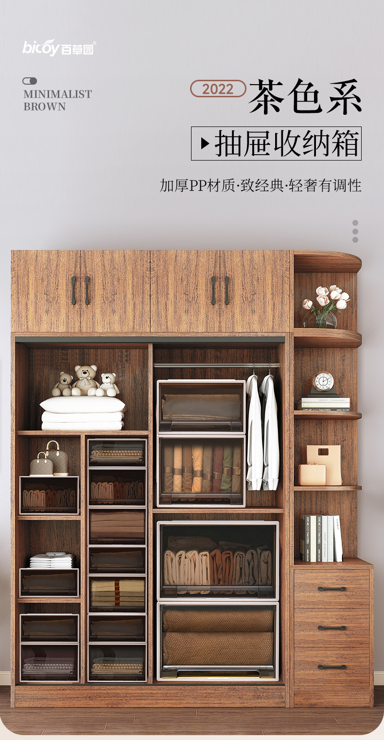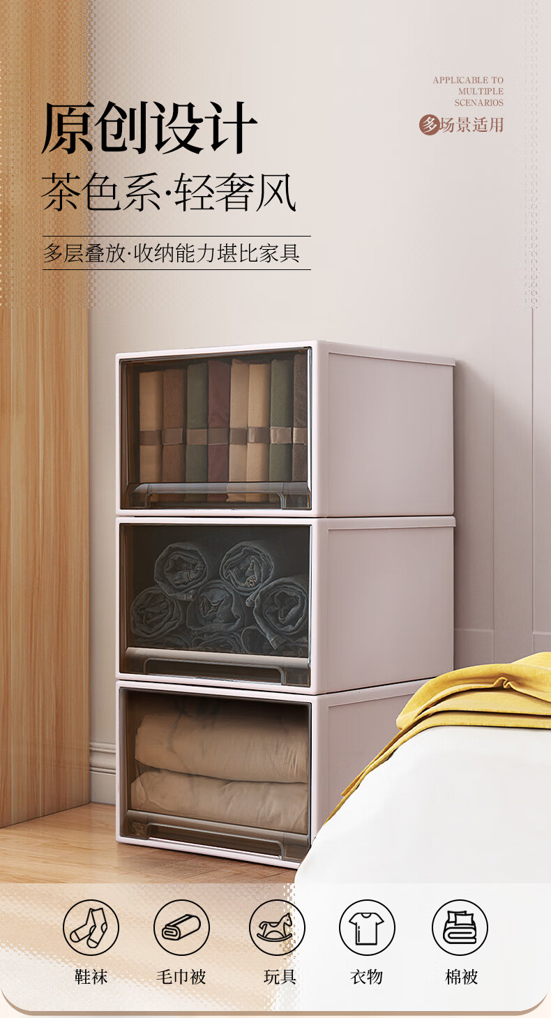 商品名称:百草园收纳箱抽屉式收纳柜储物柜床头柜内衣收纳盒整理箱42L3个装茶色